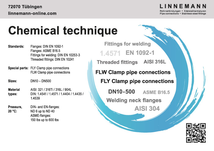 For the field of chemical technology, LINNEMANN offers standardised flanges according to DIN EN 1092-1 and ASME B16.5. Furthermore, LINNEMANN has also designed the FLW connection with quick release clamping rings especially for large pipe dimensions from DN300. Another development is the FLY pipe connection in which the seal is located in a rectangular groove where it is protected from the medium. The LINNEMANN GmbH chemical technology product is rounded off by weld fittings according to DIN EN 10253-3, threaded fitting pursuant to DIN EN 10241 and pipes according to ISO 1127.