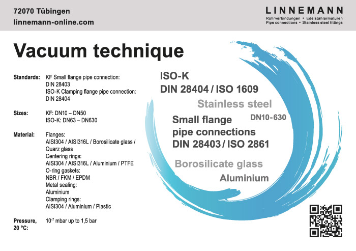 In order for vacuum systems to provide reliably stable suction performances, the pipe connections must guarantee long-term tightness even at high vacuum. Depending on the medium, LINNEMANN offers the required stainless steel, aluminium or glass components in accordance with standards DIN 28403 ISO 2861 for the KF small flange connections and DIN 28404 ISO 1609 for ISO-K clamping flange connections. Required flexible connections can be supplemented from the hose program. LINNEMANN offers metal hoses as well as hoses with support spirals, which are assembled appropriately and can therefore be integrated safely.